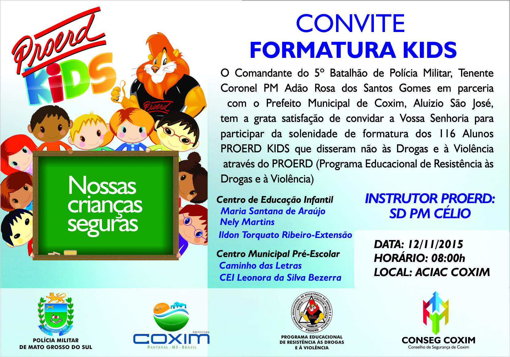 Coxim (MS) – o 5º Batalhão de Polícia Militar Realizará amanhã (12), às 08:00 horas na Associação Comercial e Industrial de Coxim (ACIAC), a formatura dos 116 alunos do Proerd Kids de Educação Infantil das Escolas de Coxim-MS. Assessoria de