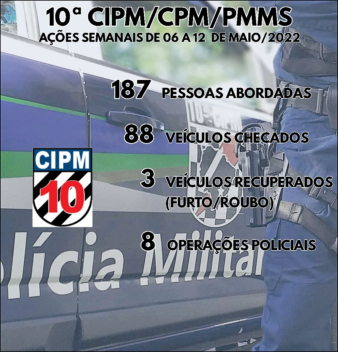 Campo Grande (MS) – A 10ª CIPM – Companhia Independente de Polícia Militar, divulga o levantamento semanal do período de 06 a 12 de junho de 2022. Nesta semana 187 pessoas foram abordadas, 88 veículos checados, 03 veículos recuperados (com