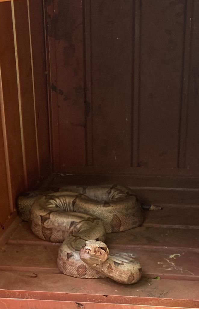 Campo Grande (MS) – O funcionário de uma fábrica de bebidas no anel rodoviário, próxima ao aterro sanitário, telefonou para a PMA de Campo Grande, informando sobre a presença de duas serpentes que estavam em um barracão da empresa hoje (30) às