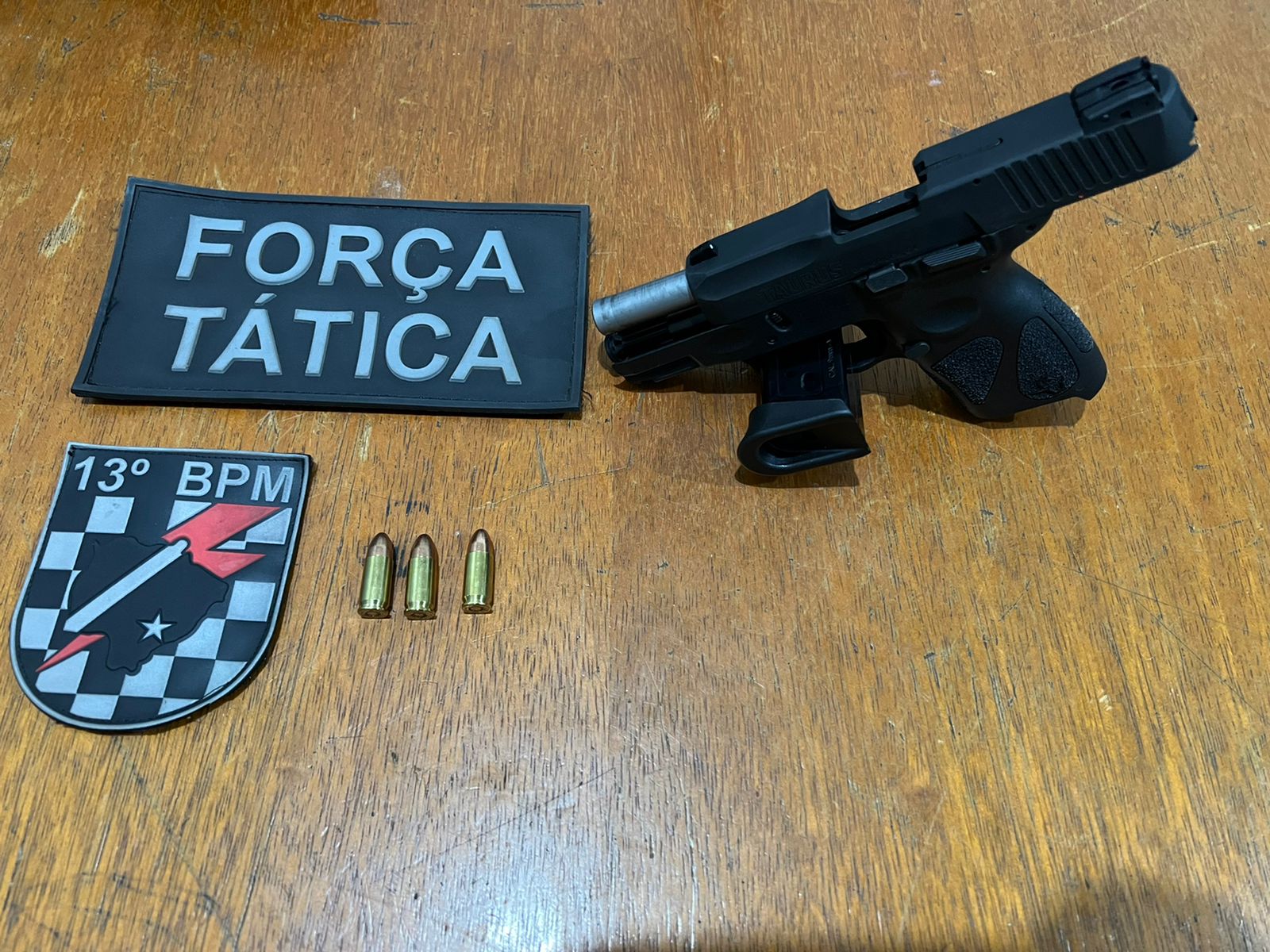 Policiais militares da Força Tática do 13º Batalhão realizaram, na noite de sábado (07), a apreensão e uma arma de fogo modelo pistola Taurus G2C Cal. 9mm. Veja mais detalhes! Chegou ao conhecimento da equipe de Força Tática que estaria ocorrendo uma