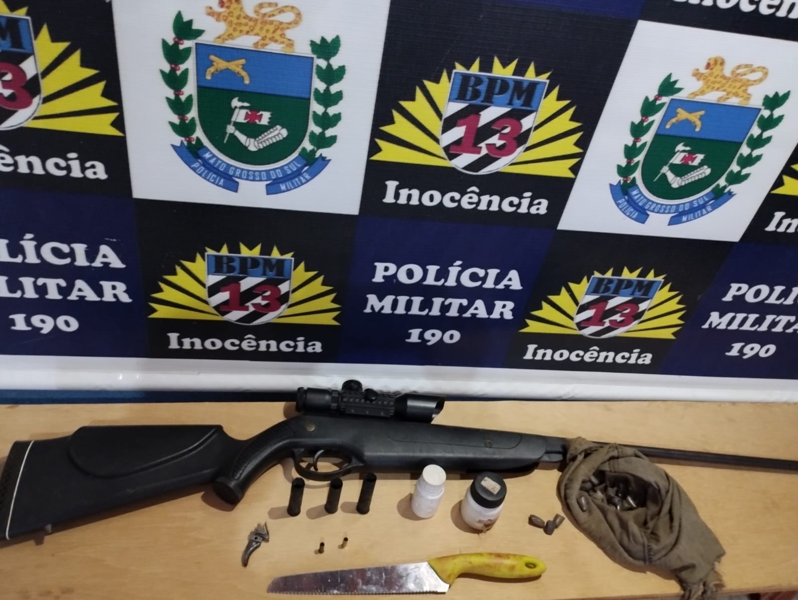 Paranaíba (MS) – Policiais militares do 13º Batalhão realizaram a prisão de um indivíduo que agrediu sua esposa no Distrito de São Pedro, durante o atendimento da ocorrência os policiais localizaram uma espingarda adaptada para calibre 22 e