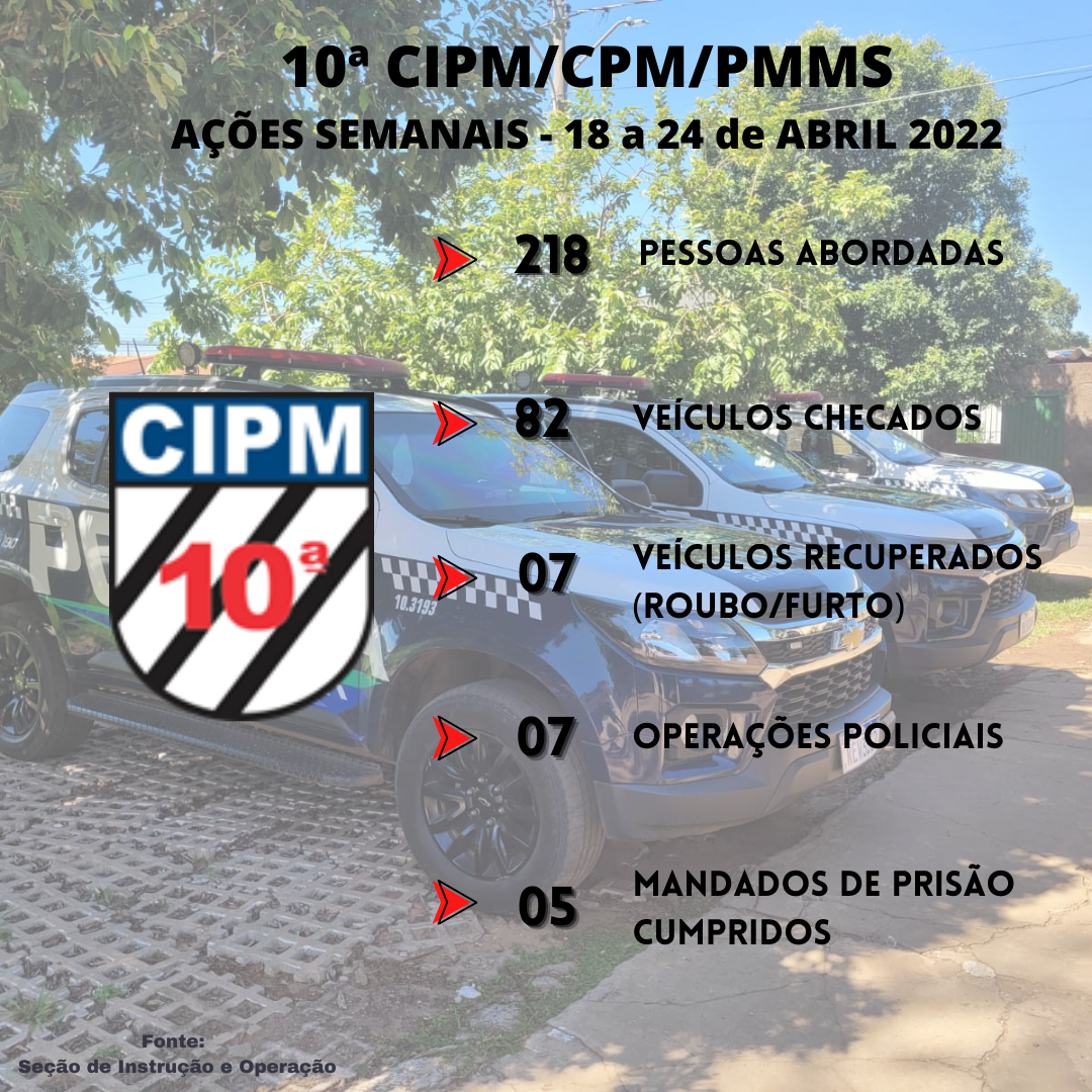Campo Grande (MS) – A 10ª CIPM – Companhia Independente de Polícia Militar, divulga o levantamento semanal do período de 18 a 24 de abril 2022. Nesta semana, 218 pessoas foram abordadas, 82 veículos checados, 07 veículos recuperados (com