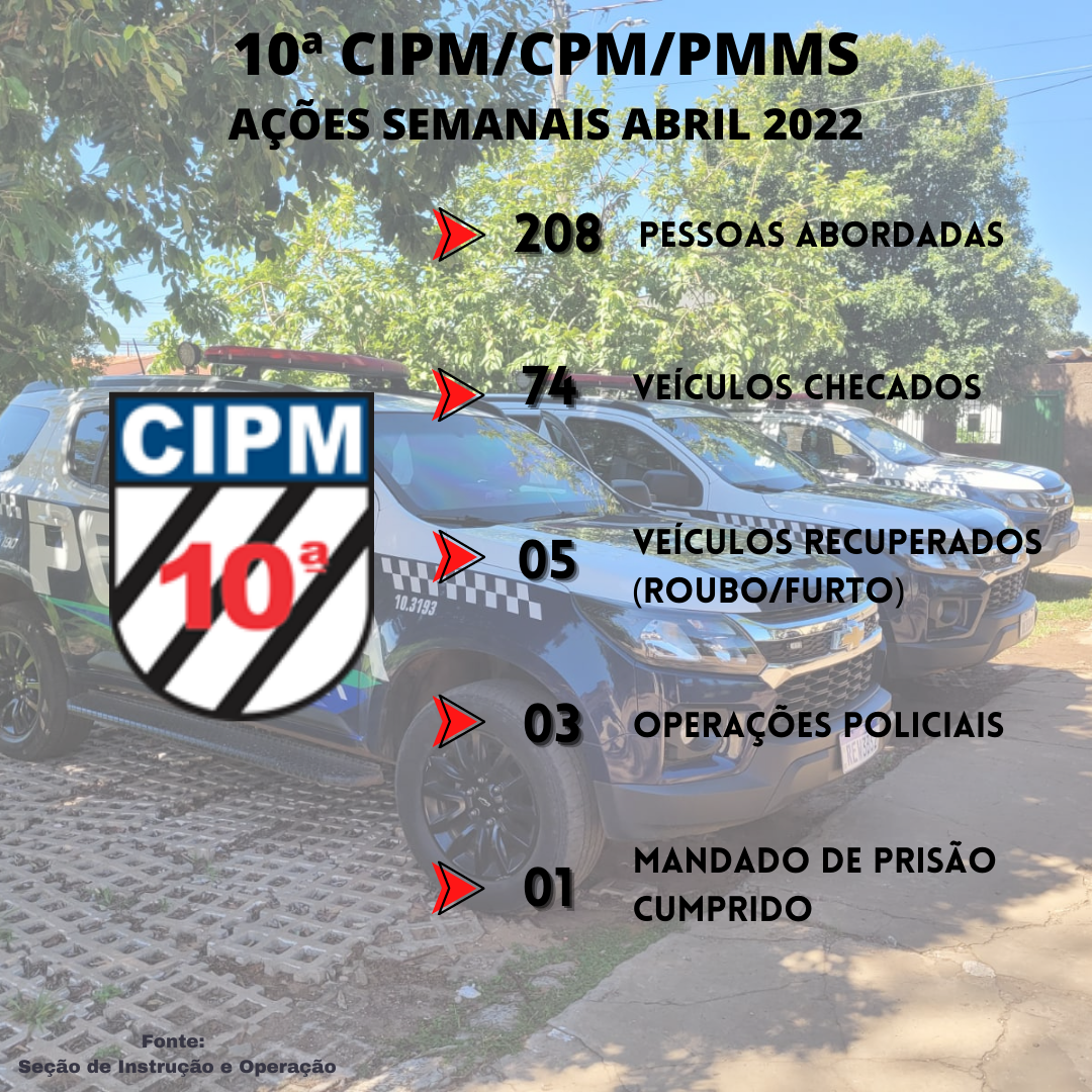 Campo Grande (MS) – A 10ª CIPM – Companhia Independente de Polícia Militar, divulga o levantamento semanal do período de 11 a 17 de abril 2022. Nesta semana, 208 pessoas foram abordadas, 74 veículos checados, 05 veículos recuperados (com
