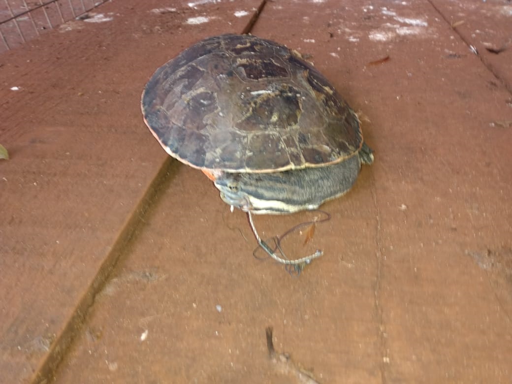 Campo Grande (MS) – Policiais Militares Ambientais de Dourados foram procurados por um homem, que entregou ontem (11) pela manhã, um animal silvestre conhecido popularmente como cágado. O homem (40) informou que encontrou o animal com um anzol preso