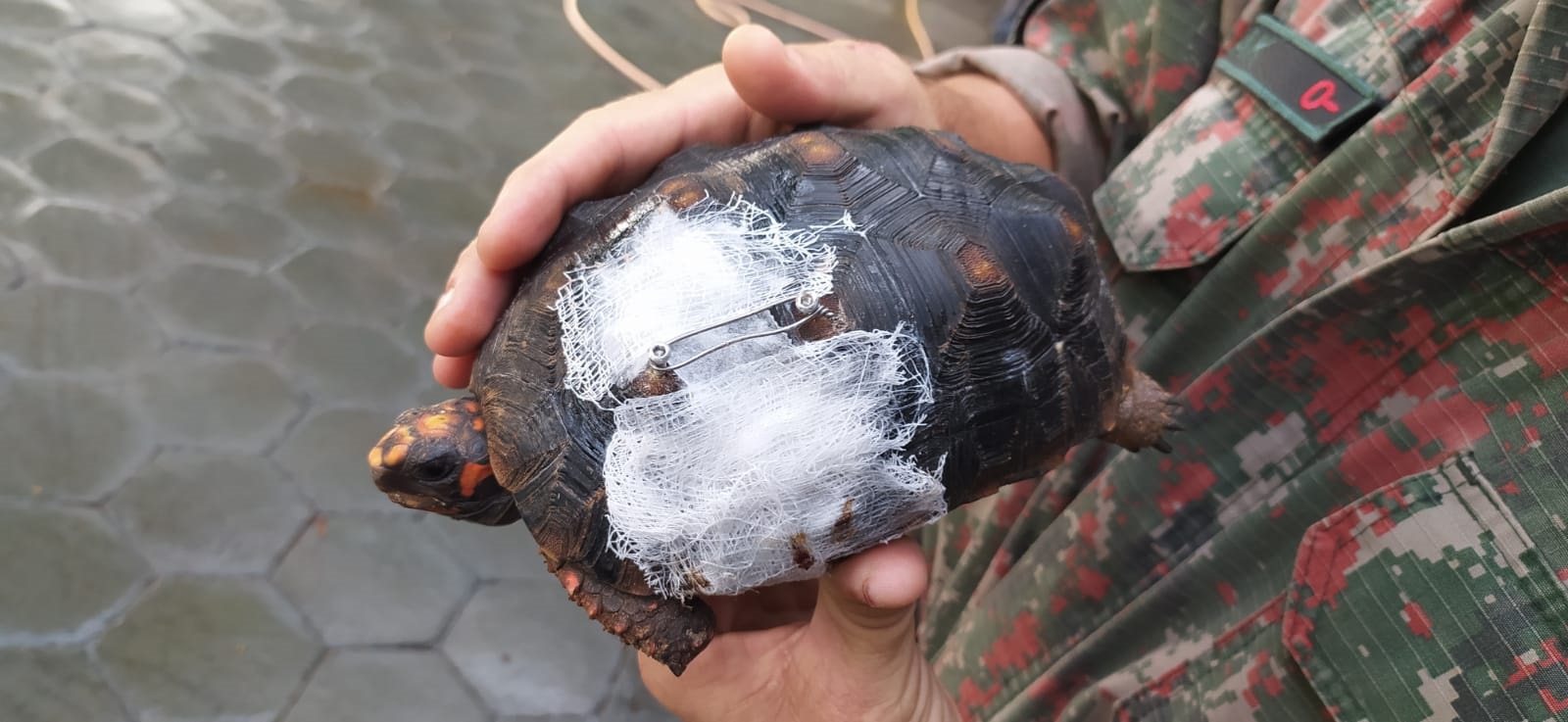 Campo Grande (MS) – A Polícia Militar Ambiental de Naviraí realizava fiscalização na área rural do município hoje (5) e encontrou, às 9h15, um animal da espécie jabuti (Chelonoidis carbonaria) ferido, vítima de atropelamento, na rodovia MS 489, a