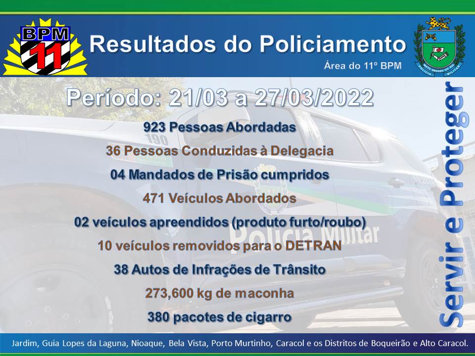 Jardim (MS) – Na manhã desta segunda-feira (28) o Comandante do 11º BPM de Jardim, tenente-coronel Wilson César Velasques, divulgou os resultados alcançados através das ações do policiamento ostensivo preventivo e repressivo realizadas entre os