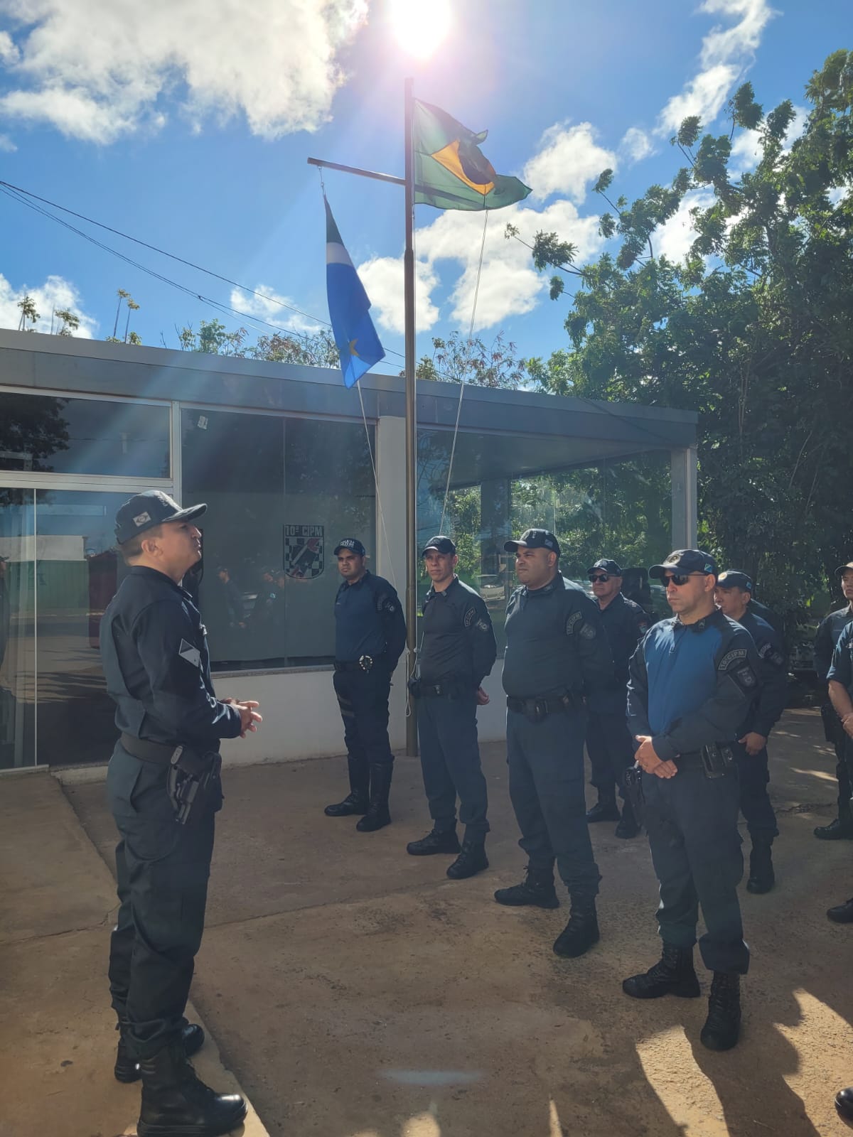 Um dos quatro símbolos nacionais, o pavilhão Nacional voltou a tremular no topo do mastro na sede da 10ª CIPM, junto com o pavilhão Estadual do Mato Grosso do Sul. Com a tropa em forma, o Comandante da unidade, Ten Cel QOPM Célio, inaugurou nesta