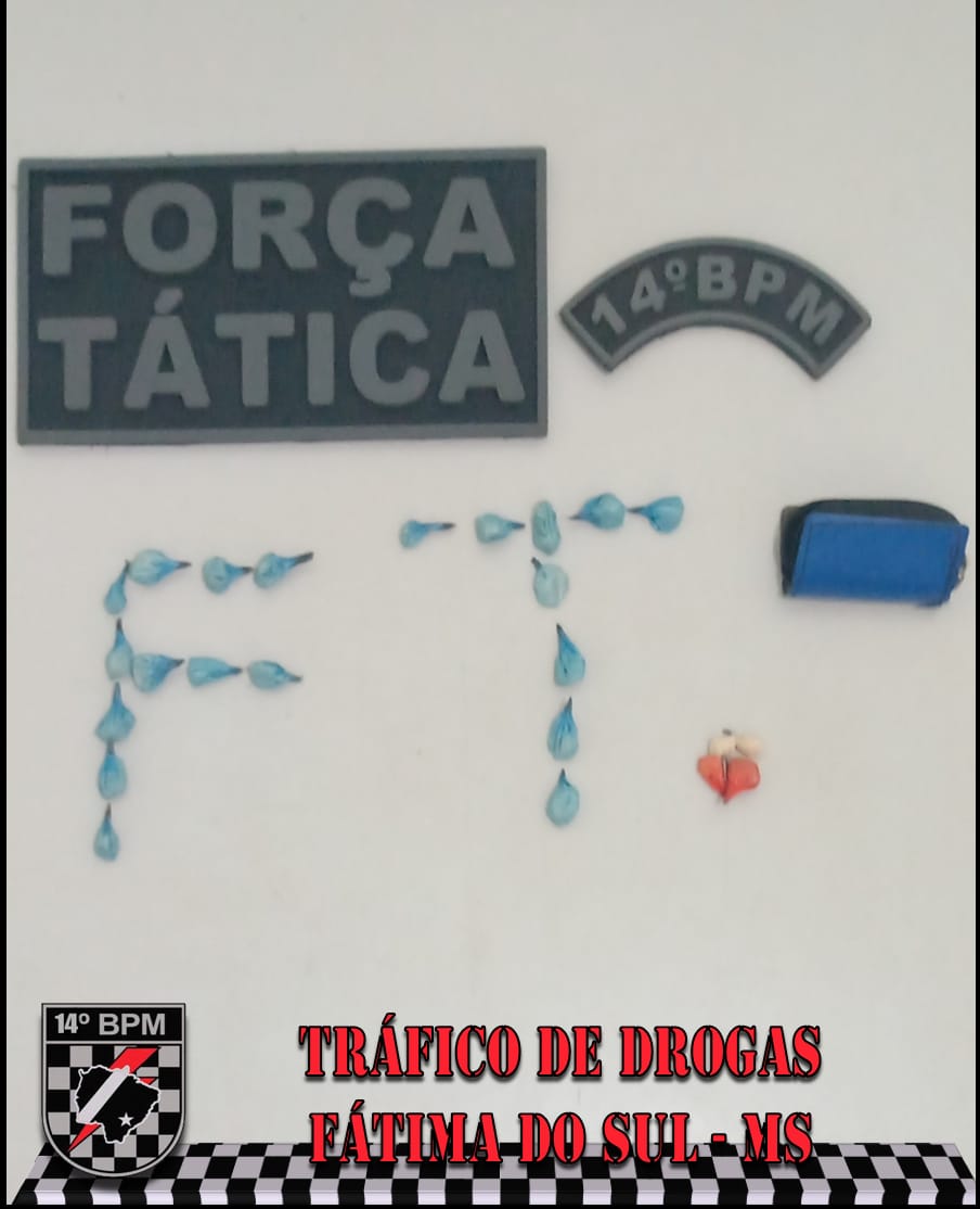 Fátima do Sul (MS) – No início da noite desta quinta-feira (27/01), Policiais Militares da Força Tática do 14º Batalhão de Polícia Militar fizeram a prisão de um homem de 19 anos por tráfico de drogas. A prisão aconteceu quando a guarnição