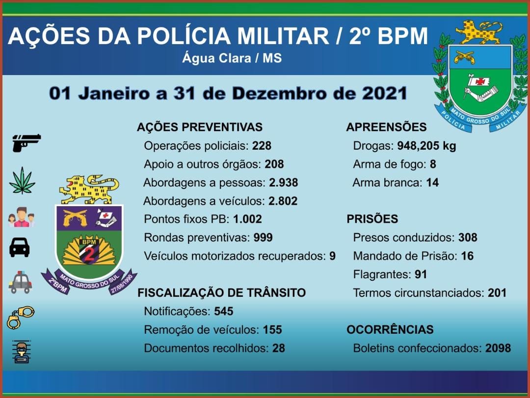 Água Clara – MS, no dia 25 de janeiro, o 3º Pelotão, da 2ª Cia, do 2º Batalhão de Polícia Militar apresentou dados referente ao trabalho desempenhado no município de Água Clara, no ano de 2021. O Capitão Wellington Luiz Peralta Cuenca, Comandante
