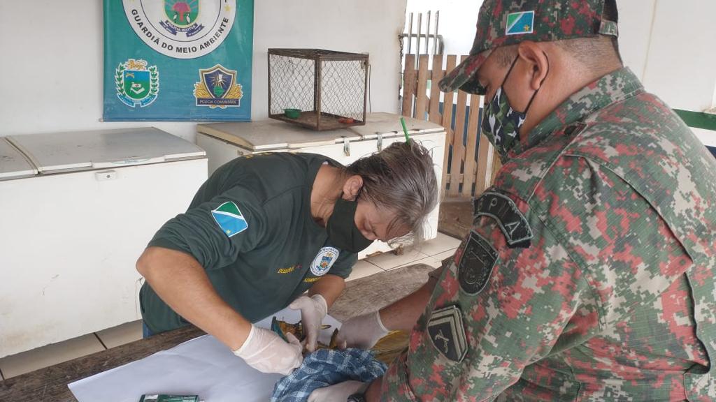 Campo Grande (MS) – Policiais Militares Ambientais capturaram hoje (19) pela manhã uma arara-Canindé em uma residência no Distrito de Miranda Duque Estrada. Um morador ligou para a PMA informando que o animal caiu no seu quintal e aparentava estar