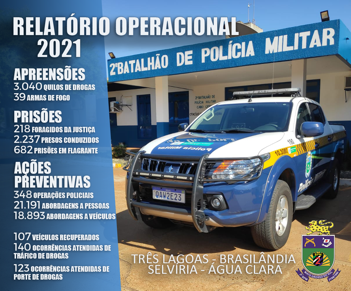 Três Lagoas – MS, o 2º Batalhão de Polícia Militar divulga o relatório operacional referente as atividades realizadas no ano de 2021, na área de atuação do 2º BPM. O 2º BPM é sediado na cidade de Três Lagoas, tendo SubUnidades nas cidades de