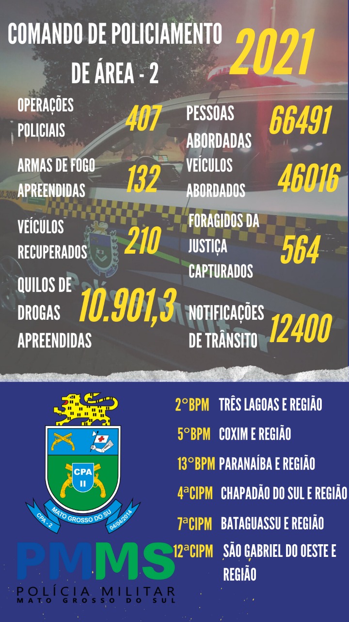 Três Lagoas (MS) – O Comando de Policiamento de Área 2 (CPA-2) divulgou, nesta terça-feira (04), o balanço das atividades desenvolvidas em toda a sua área de circunscrição durante o ano de 2021. O CPA-2 é composto pelos 2º Batalhão (Três Lagoas),