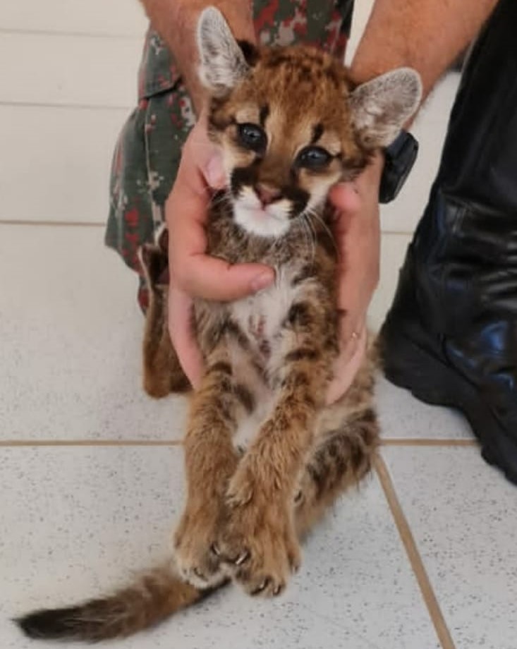 Campo Grande (MS) – Policiais Militares Ambientais de Naviraí recolheram hoje (31) pela manhã, um filhote de onça-parda (Puma concolor) encontrado no município de Iguatemi, que estaria perdido da mãe em uma plantação de soja. O animal fora avistado