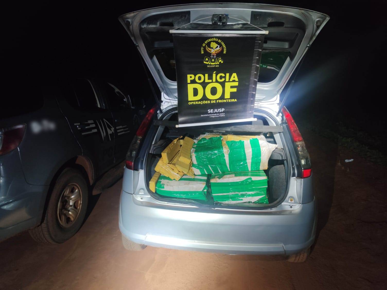 Dourados (MS), 17 de dezembro – Policiais do Departamento de Operações de Fronteira (DOF) apreenderam, na madrugada desta sexta-feira, um veículo Ford Fiesta de cor prata e placas e São Paulo, carregado com 430 quilos de maconha distribuídos em 20
