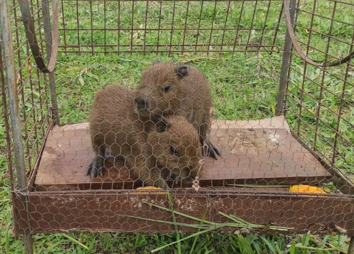 Campo Grande (MS) – Policiais Militares Ambientais de Campo Grande capturaram hoje (2) pela manhã dois filhotes de capivara (Hydrochoerus hydrochoeris) em uma propriedade rural localizada na rodovia MS 040 na Capital. Os Policiais foram acionados pela