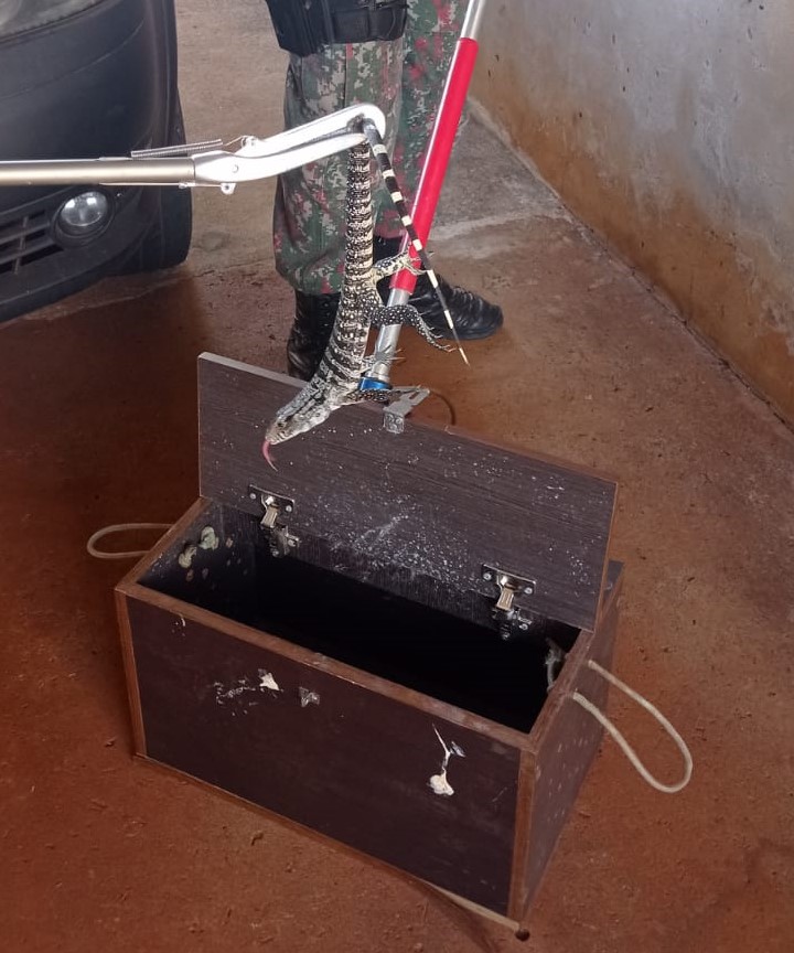 Campo Grande (MS) – Policiais Militares Ambientais de Dourados foram acionados ontem (2) à noite, por uma moradora do bairro Novo Horizonte para atender a uma ocorrência relativa a um animal silvestre da espécie Tupinambis merianae (Teiú) que