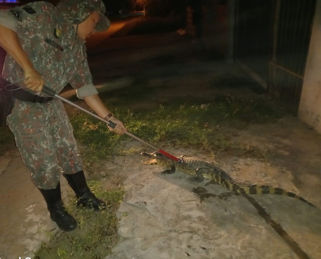 Campo Grande (MS) – Policiais Militares Ambientais de Porto Murtinho realizaram a captura de um jacaré no perímetro urbano da cidade. Uma moradora do centro da cidade acionou a PMA ontem (01) às 20h, informando que o animal estava transitando pela