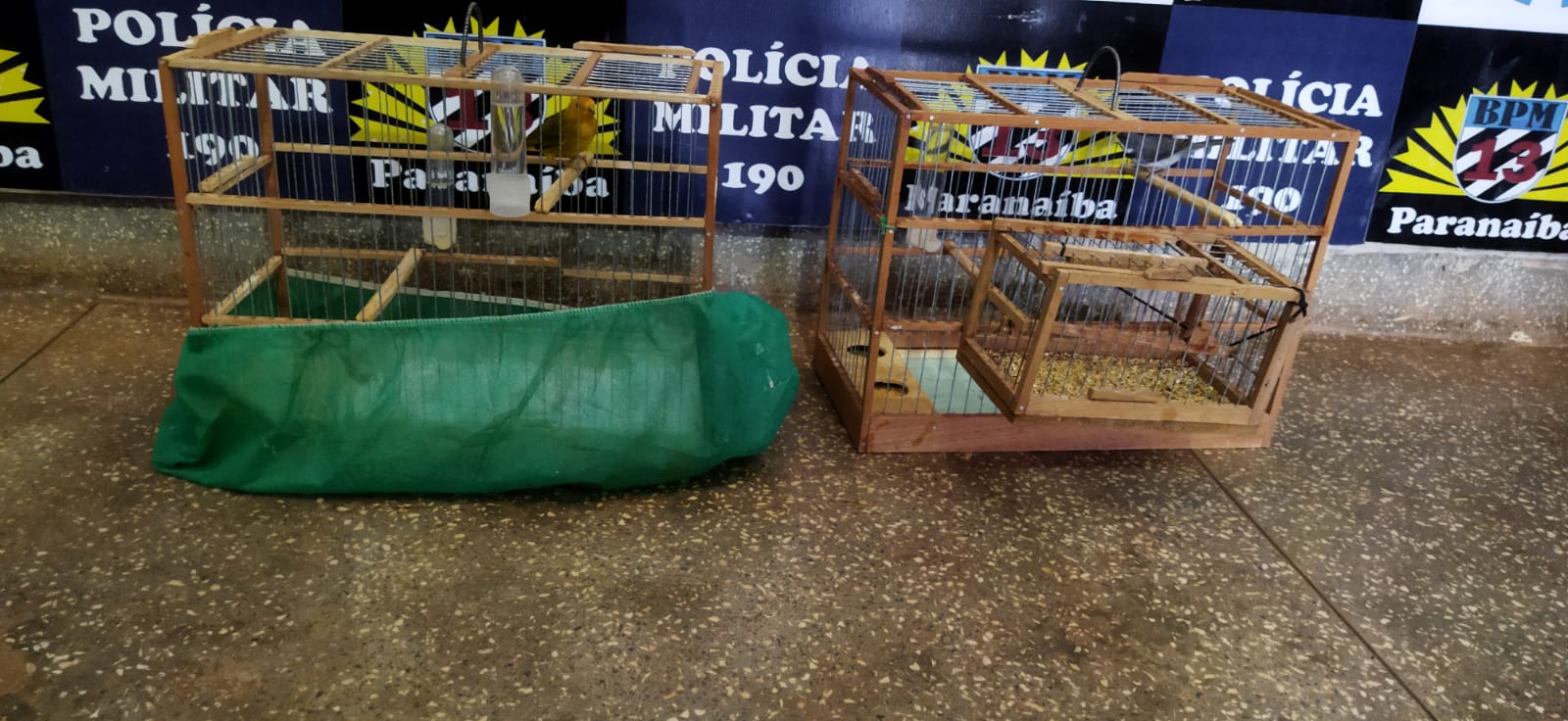 Durante ronda pelo bairro Salomé, policiais militares localizaram duas gaiolas, uma com um Canário e outra com um pássaro tipo coleira com alçapão. Uma das gaiolas se encontrava armada para captura de pássaros. As aves estavam sob o sol quente e forte
