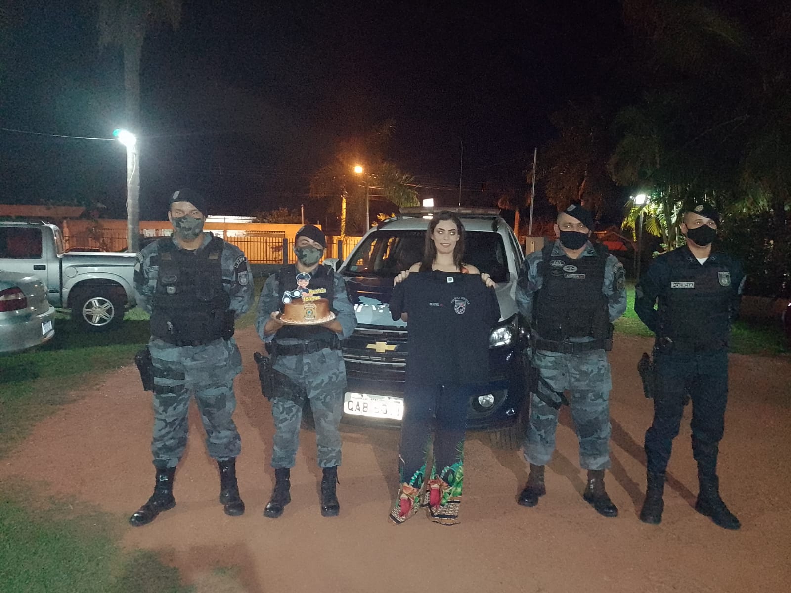 Coxim (MS) A Polícia Militar na noite do dia (23/10), surpreendeu a jovem fã Beatríz de Souza Alves que completou 18 anos em Coxim. A Guarnição da Força Tática foi convidada através da mãe da aniversariante Patrícia de Souza Alves Santos que