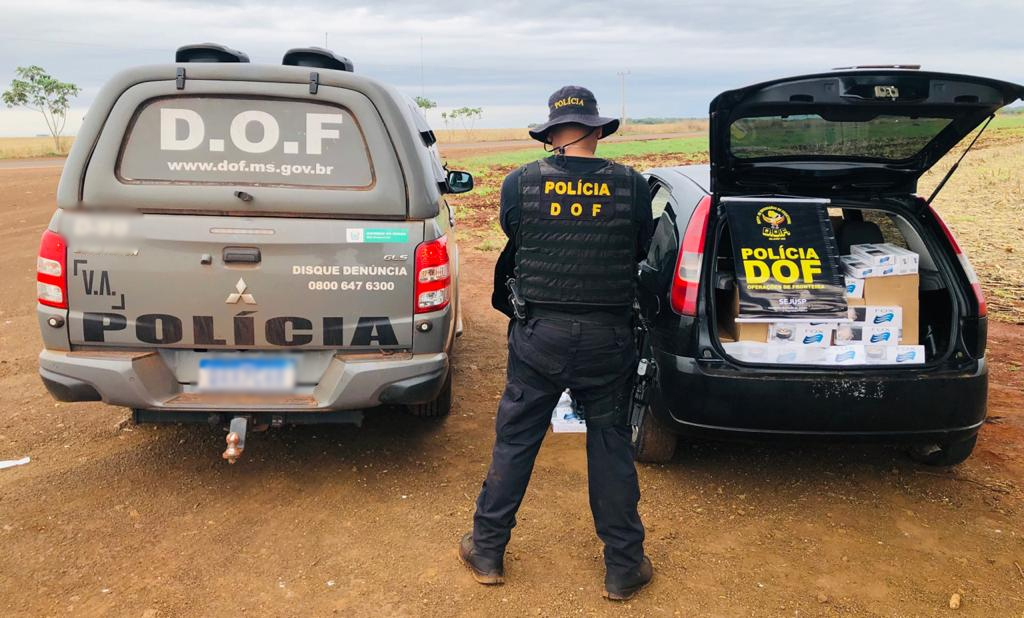 Dourados (MS), 9 de setembro – Policiais do Departamento de Operações de Fronteira (DOF) apreenderam, na tarde desta quinta-feira, um veículo Ford Fiesta, de cor preta, carregado com 05 caixas de cigarros; 330 módulos display; e, 1600 cigarros