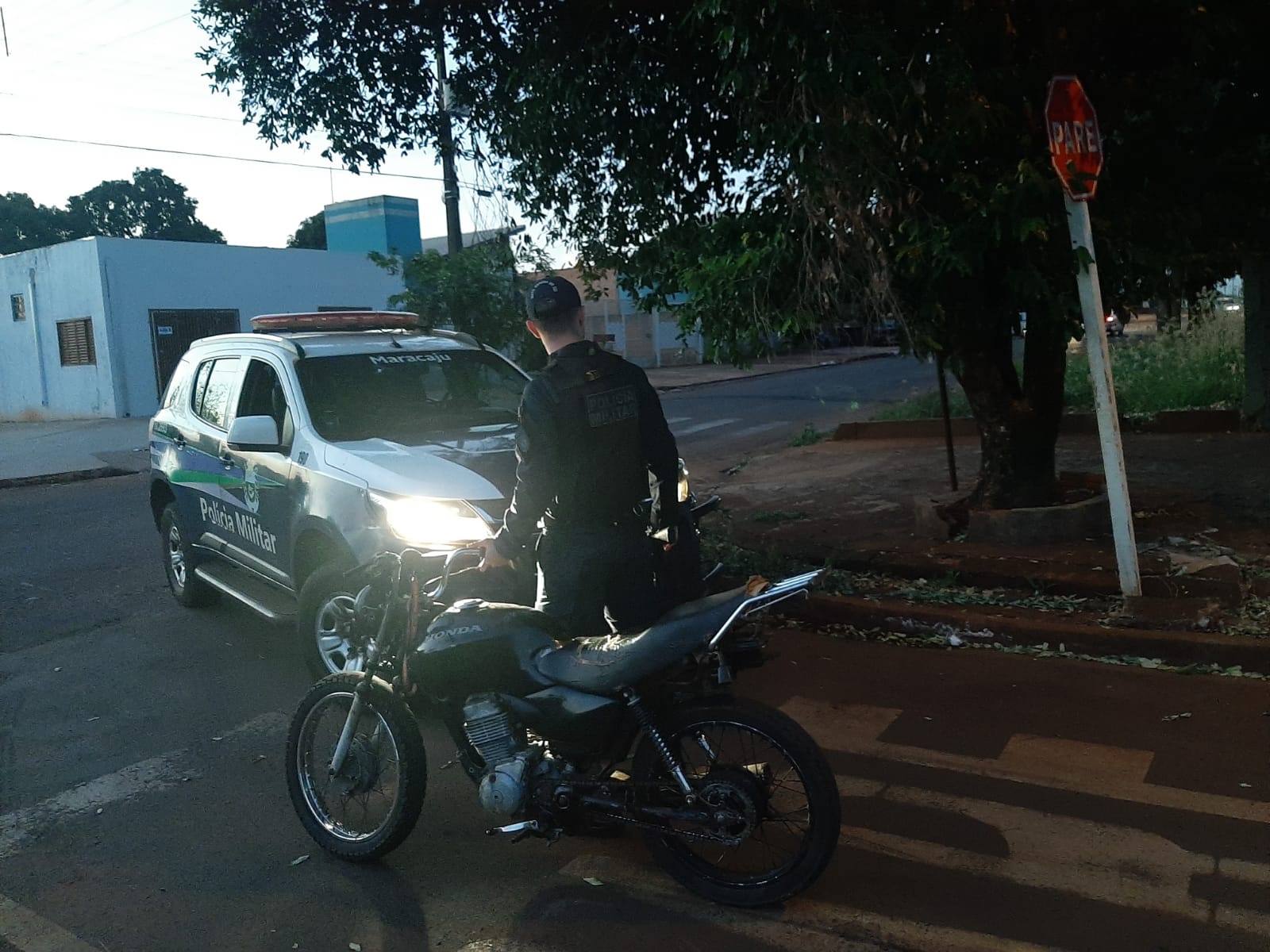 Maracaju (MS) – Por volta das 17h30min desta sexta-feira (23/07), a Guarnição da Policia Militar em rondas ostensivas e preventivas, avistou um indivíduo conduzindo uma motocicleta de cor preta sem carenagens e sem placa, foi realizada a abordagem e