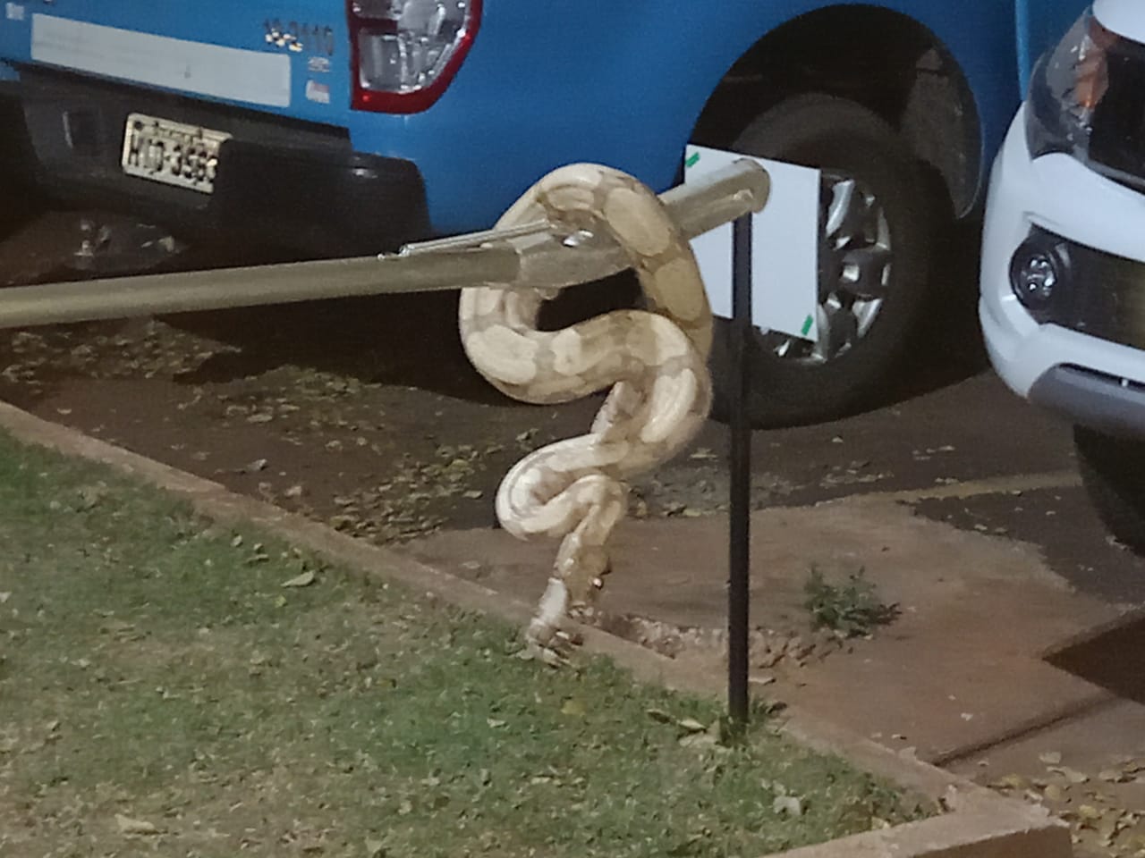 Campo Grande (MS) – Policiais Militares Ambientais de Campo Grande capturaram uma serpente da espécie Boa constrictor (jiboia) ontem (13) à noite. O motorista de um veículo VW Saveiro veio com seu carro ao quartel da PMA na Capital, informando