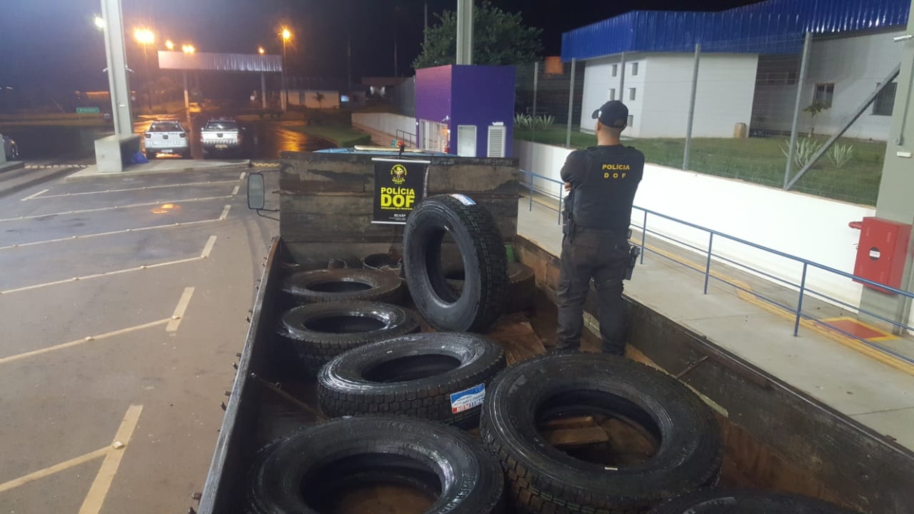 Iguatemi (MS), 04 de março – Policiais do Departamento de Operações de Fronteira (DOF) apreenderam, na manhã desta sexta-feira, um caminhão Mercedes-Benz de cor azul, com placas de Aral Moreira (MS), carregado com 10 pneus novos, de origem estrangeira,