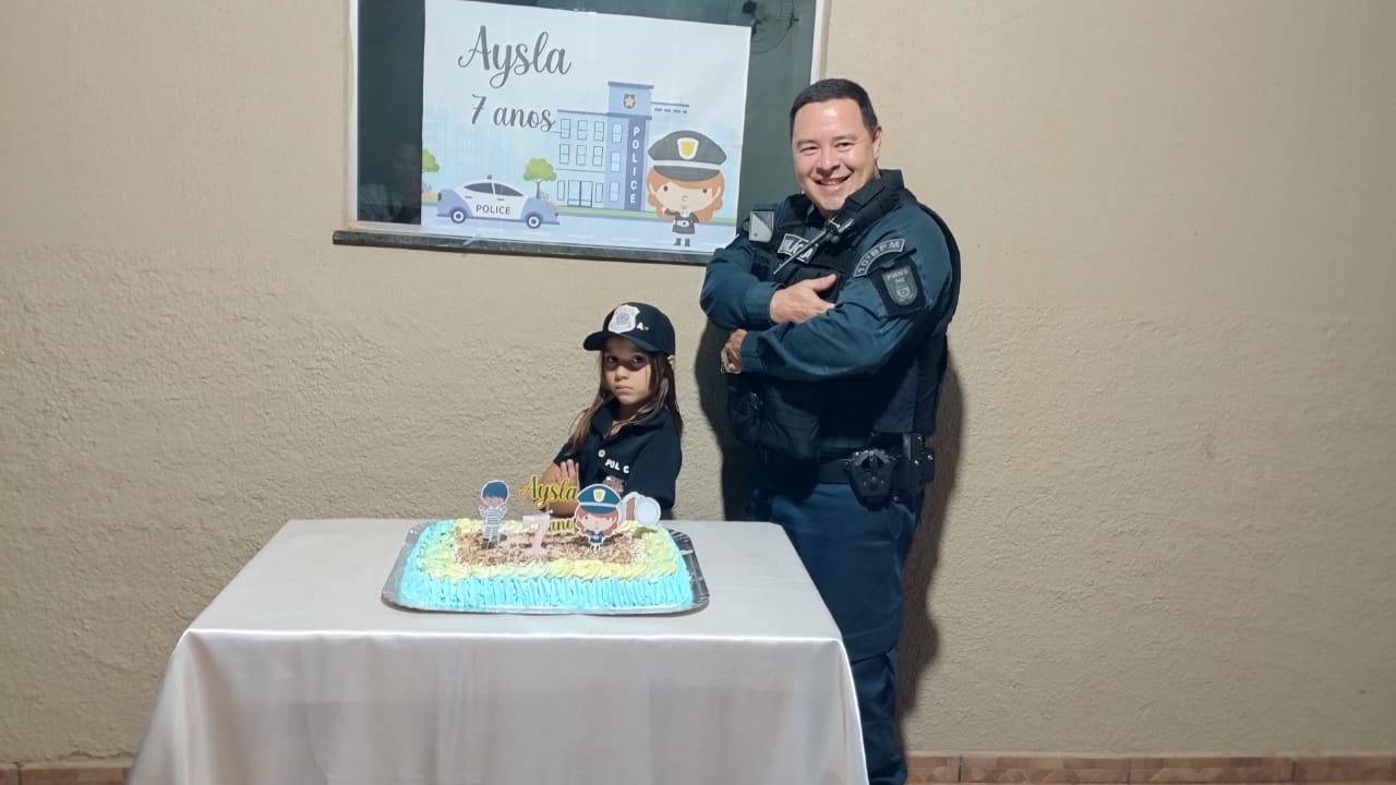 Campo Grande (MS) – Na noite desta quinta-feira (08/05), policiais militares do 10º Batalhão de Polícia Militar prepararam uma surpresa para Aysla em sua festa de aniversário de 7 anos. A criança é admiradora da instituição e escolheu a