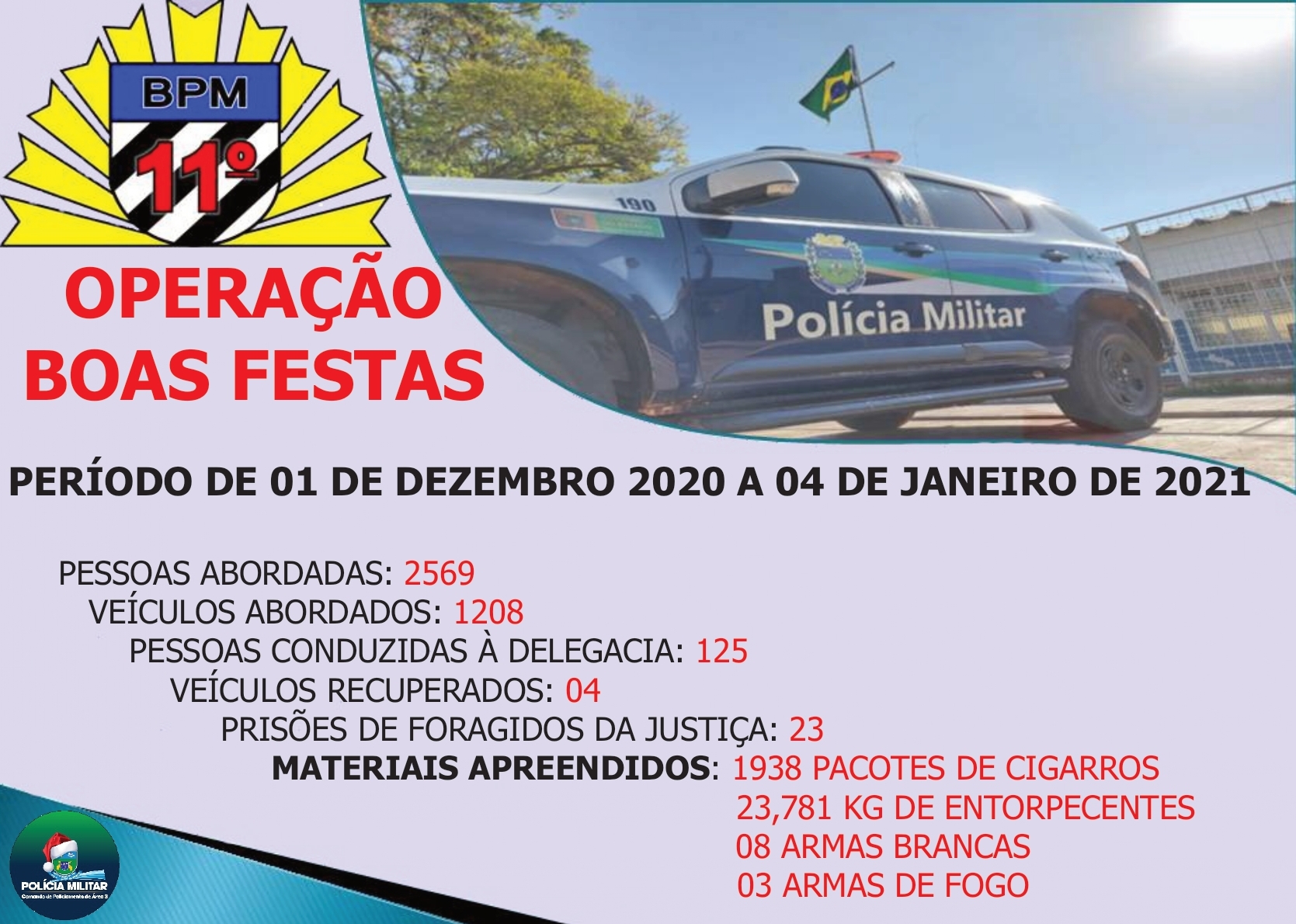 Jardim (MS) – A Polícia Militar do Estado de Mato Grosso do Sul desencadeou, entre os dias 01 de dezembro de 2020 a 04 de janeiro de 2021, em todo o território sul-mato-grossense, a Operação Boas Festas, que teve como objetivo garantir a ordem e a