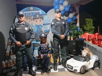 Coxim (MS) – A Polícia Militar participou neste sábado (20/09), da comemoração do aniversário de Nicolas Ferreira, um grande admirador da Instituição, que completou 6 anos de idade em Pedro Gomes. O tema da festa não poderia ser outro: Polícia