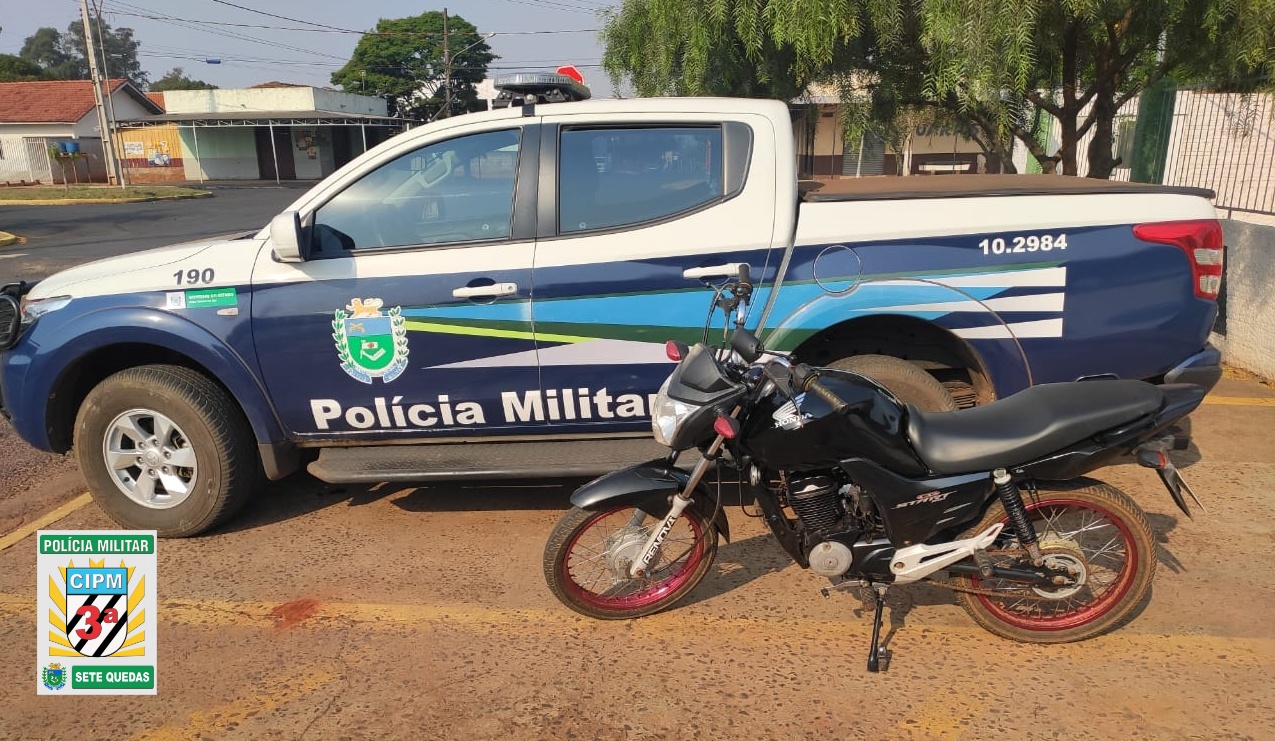 3ª CIPM – Na noite deste domingo (4) a equipe de Rádio Patrulha da Polícia Militar de Sete Quedas recuperou uma motocicleta que tinha sido furtada no dia anterior e prendeu o suspeito de ter subtraído ou receptado o veículo. Os policiais militares