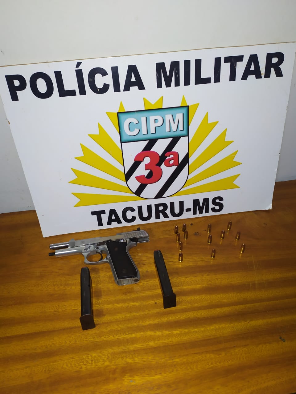 3ª CIPM – Na noite desta terça-feira (25) a equipe de Rádio Patrulha da Polícia Militar de Tacuru apreendeu uma pistola usada por jovens que supostamente realizavam disparos na via pública. A equipe recebeu uma denúncia anônima informando sobre