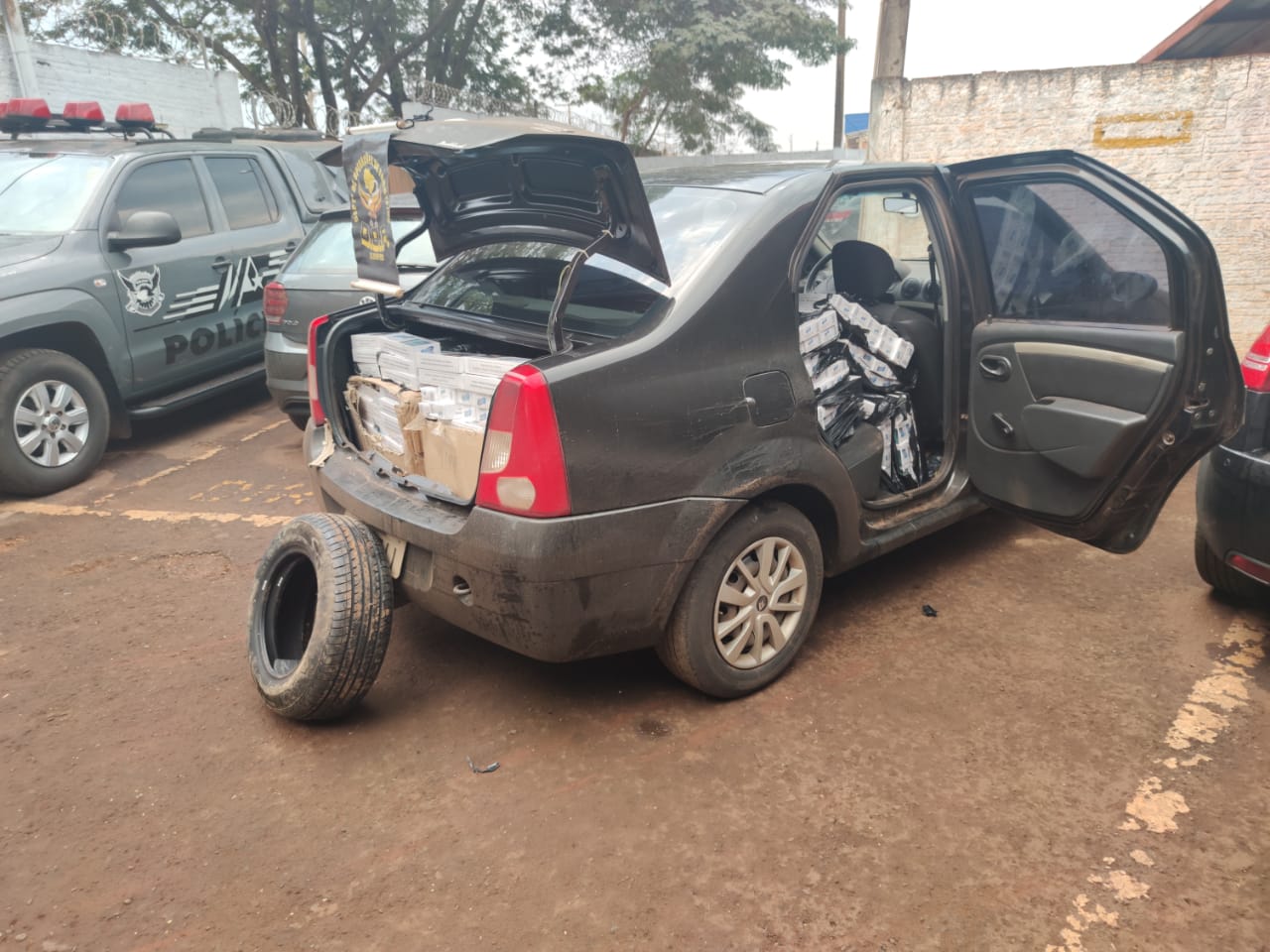 Ponta Porã (MS), 13 de agosto – Policiais Militares do Departamento de Operações de Fronteira (DOF) apreenderam, na manhã desta quinta-feira, um veículo Renault Logan carregado com 375 pacotes de cigarros de origem estrangeira mais dois pneus, sem a