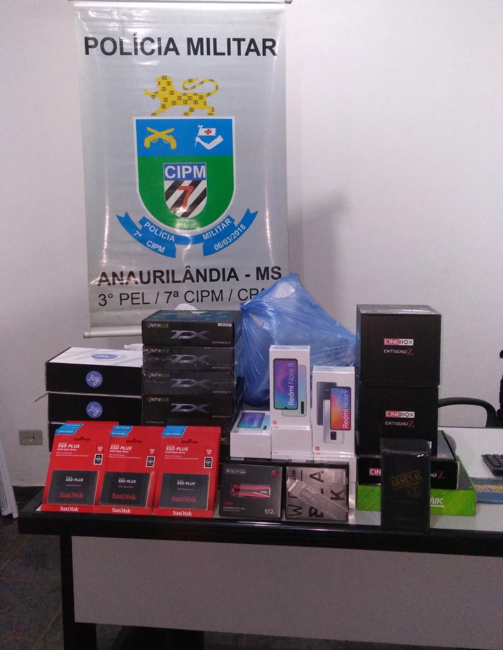 Anaurilândia (MS) – Na tarde de terça-feira (14/07), a guarnição da Polícia Militar em Anaurilândia apreendeu diversos produtos eletrônicos oriundos do Paraguai, sem a documentação legal de importação. Os policiais realizavam rondas pela