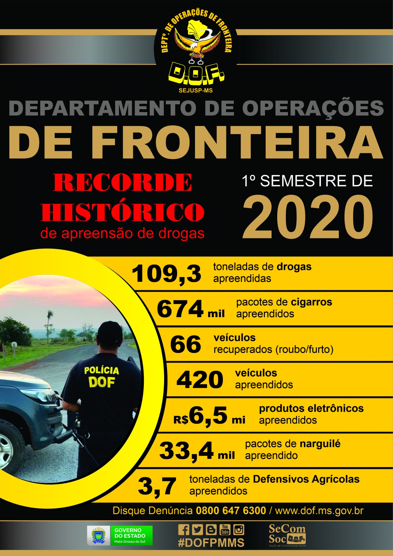 Semestre marca novo recorde histórico na apreensão de drogas Dourados (MS), 1º de julho – O Departamento de Operações de Fronteira (DOF) divulga, nesta quarta-feira um balanço geral dos resultados das atividades operacionais desenvolvidas no 1º