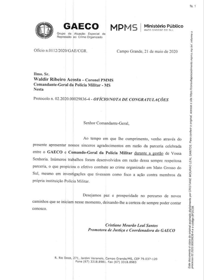 Campo Grande (MS) – O Comandante-Geral da Polícia Militar, Coronel PM Waldir Ribeiro Acosta recebeu na data de hoje (21/05) um Ofício/Nota de Congratulações do Grupo de Atuação Especial de Repressão ao Crime Organizado (GAECO). O Ofício/Nota foi