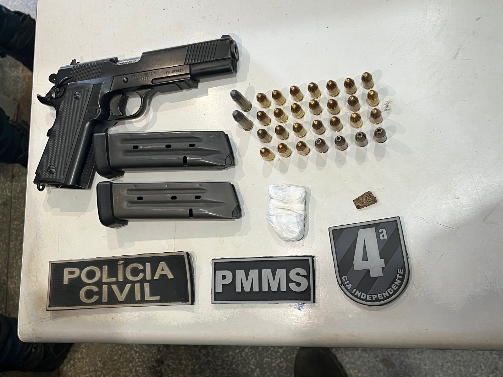 Chapadão do Sul (MS): Na tarde desta quinta-feira, a Polícia Militar e a Polícia Civil cumpriram um mandado de busca em uma residência, onde foi localizada uma pistola calibre .380 com dois carregadores municiados e prontos para uso, com 28 munições