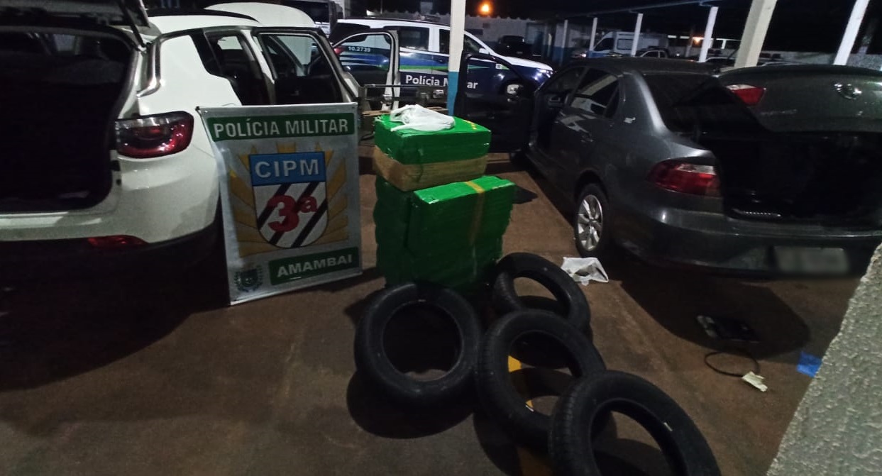 3ª CIPM Amambai – Na noite desta quarta-feira (29) uma equipe de Rádio Patrulha da Polícia Militar de Amambai prendeu dois paulistas que tentavam cruzar a cidade em dois veículos que transportavam fardos de maconha e pneus de origem estrangeira. As