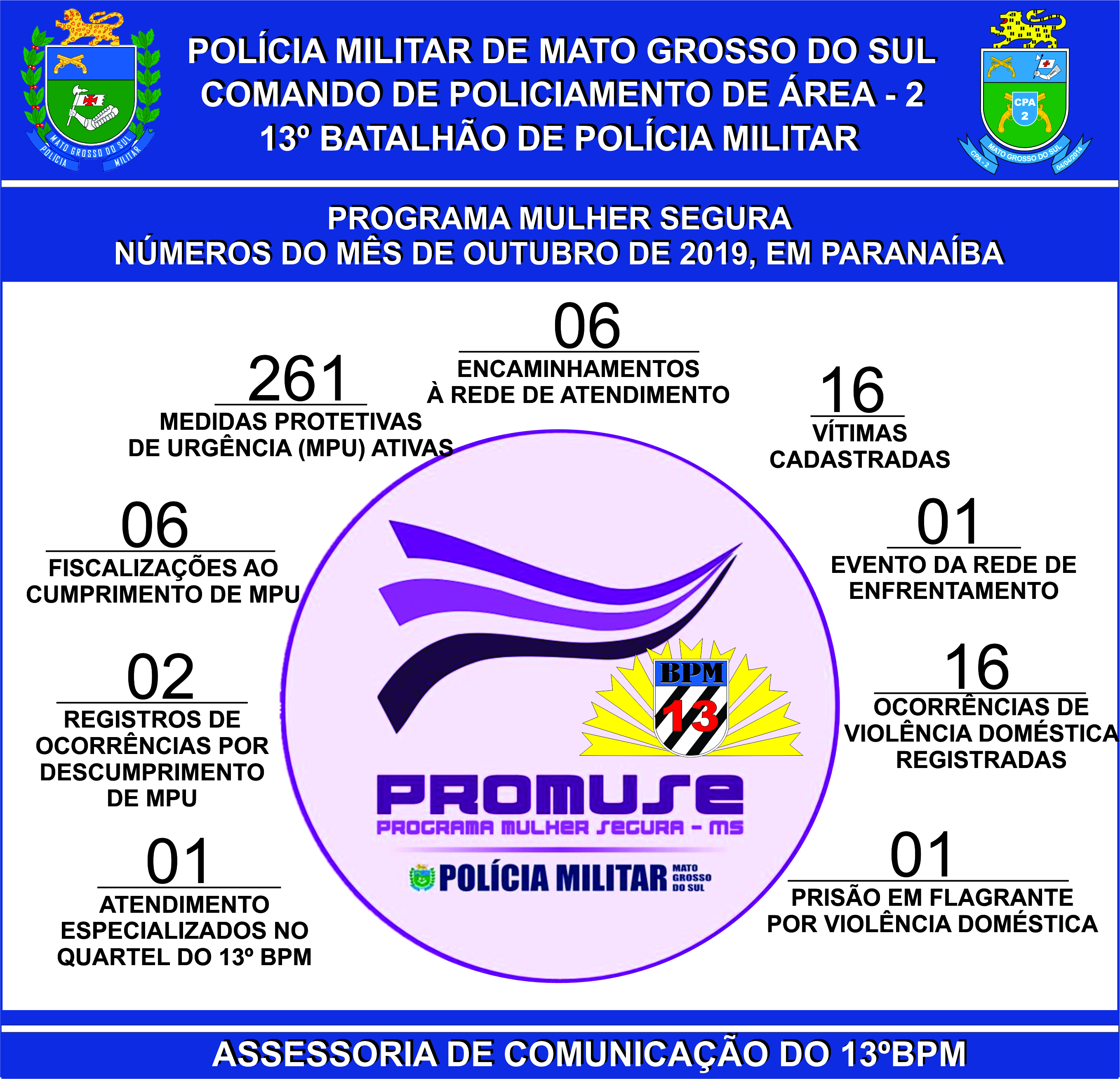 Paranaíba (MS) – o 13º Batalhão de Polícia Militar divulgou, nesta quarta-feira (06/11), o balanço das atividades desenvolvidas pelo Programa Mulher Segura – PROMUSE – nesse mês de outubro em Paranaíba. O “PROMUSE” tem