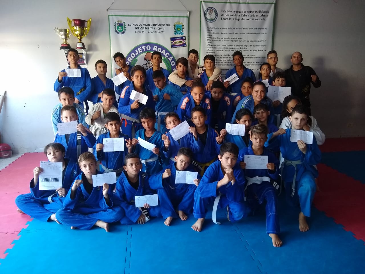 Paranaíba (MS) – Na última sexta-feira (01/11), os alunos do Projeto Reação receberam um grau em suas respectivas faixas, onde o instrutor do projeto, o Soldado PM Eliezer Machado de Lima, lembra que para obter a faixa seguinte, o aluno deve obter
