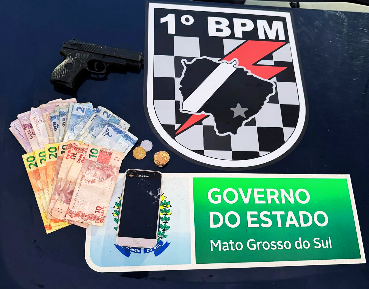Campo Grande (MS) – No final da tarde da última segunda-feira (26/02), policiais do 1º BPM (Batalhão de Polícia Militar) prenderam em flagrante um homem suspeito de roubo em uma loja no centro da cidade. O indivíduo foi detido por populares durante sua tentativa de fuga, após usar um simulacro de arma de fogo para amedrontar a funcionária do estabelecimento.