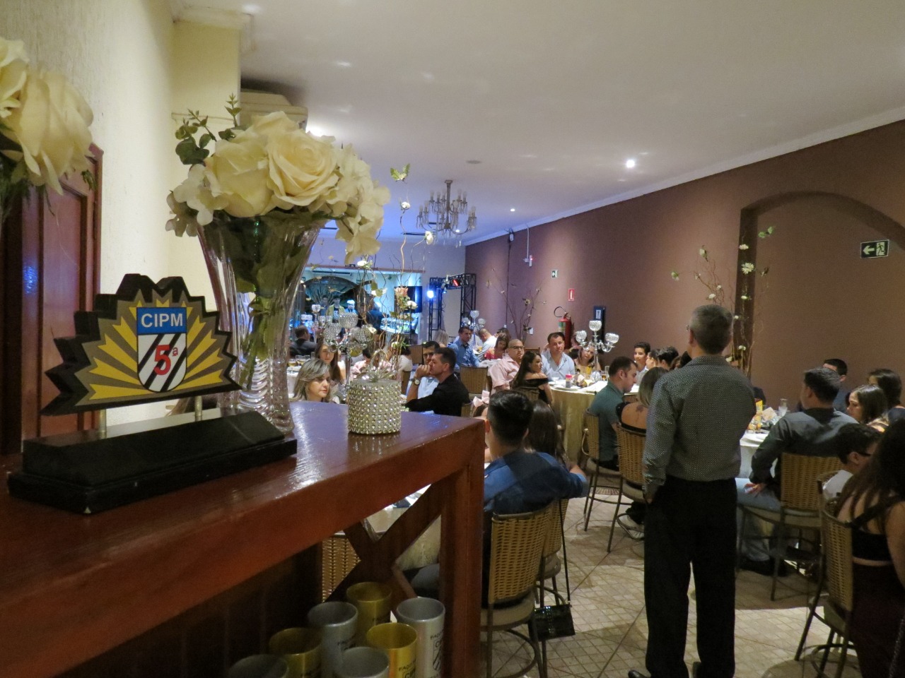 O jantar seguiu com a fala do Comandante do CPM, Cel Monari, que agradeceu primeiramente a Deus e toda a equipe da 5ª CIPM, que conforme suas palavras tem feito a diferença através de um trabalho dinâmico, desenvolvido com criatividade que resultou na superação das dificuldades enfrentadas e agradeceu ainda a família de cada um ali presente, que são o suporte para que cada policial militar possa desempenhar seu árduo papel e por fim parabenizou a todos pelo trabalho realizado em 2019 e pelo jantar oferecido.