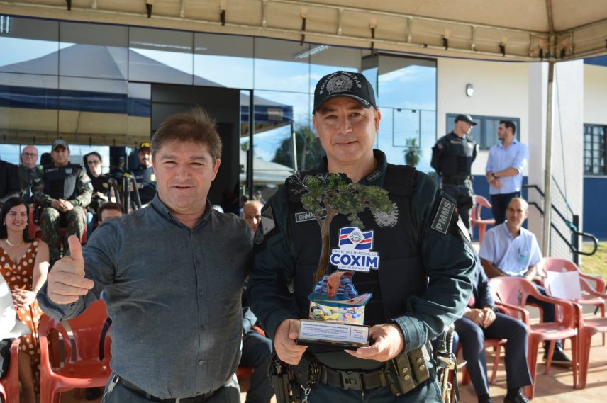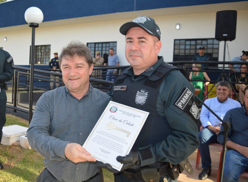 O Tenente-coronel Magno recebeu das mãos do prefeito de Coxim uma placa com a chave da cidade.