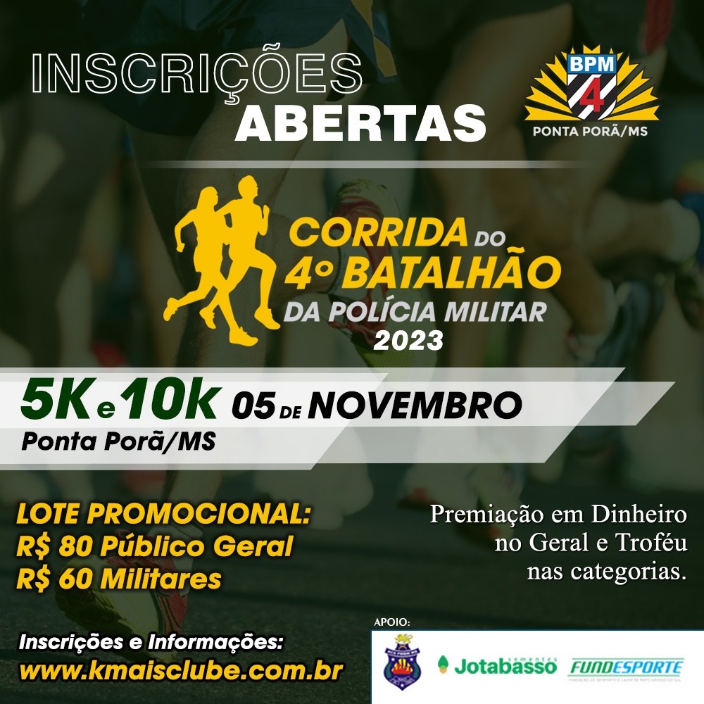 Ponta Porã (MS) – Em novembro, acontece em Ponta Porã a corrida promovida pelo  4º BPM (Batalhão de Polícia Militar), com premiações em dinheiro e troféus.