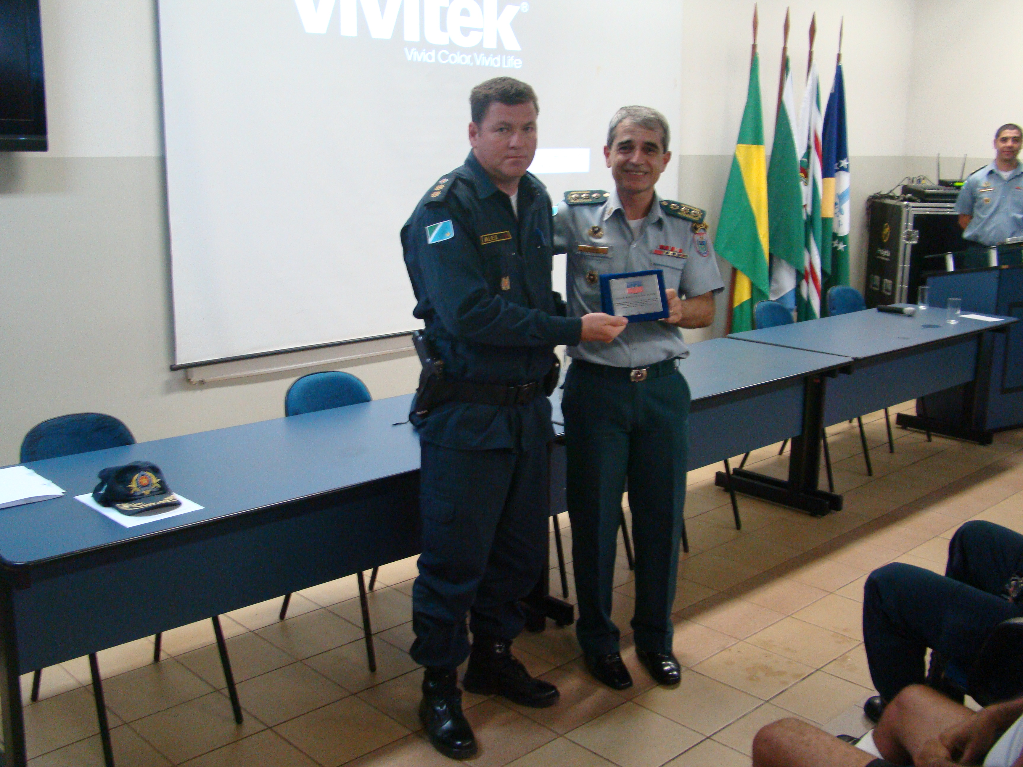 Ao final do encontro o Chefe do Estado Maior, Coronel Rogério entregou uma placa ao Comandante do 8º Batalhão Tenente Coronel Rodrigo Alex Potrich, em alusão à visita e ao bom trabalho prestado frente à unidade guardiã do Vale do Ivinhema, homenagem compartilhada pelo TC Alex com todo seu efetivo.