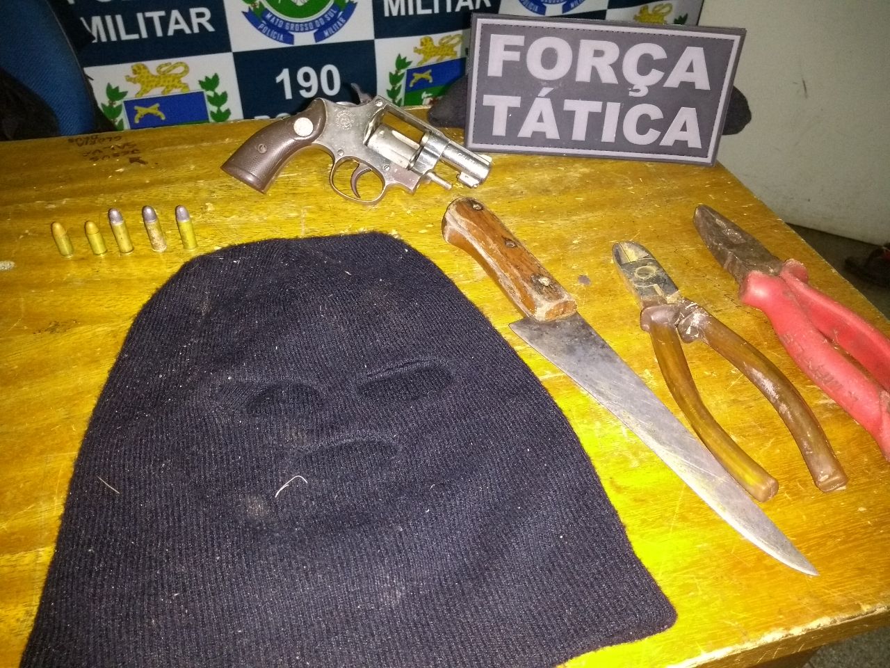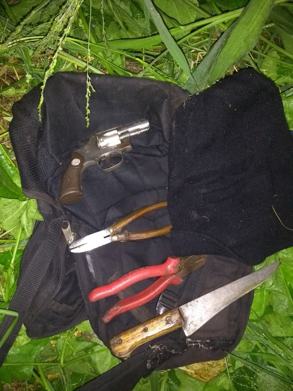 Após deter os autores e recuperar os objetos, as equipes realizaram uma busca minuciosa pelo local com o intuito de localizar a referida arma de fogo citada pela vítima, obtendo êxito em encontrar uma mochila, sendo que dentro havia um revólver cl. 32, uma faca e um alicate.