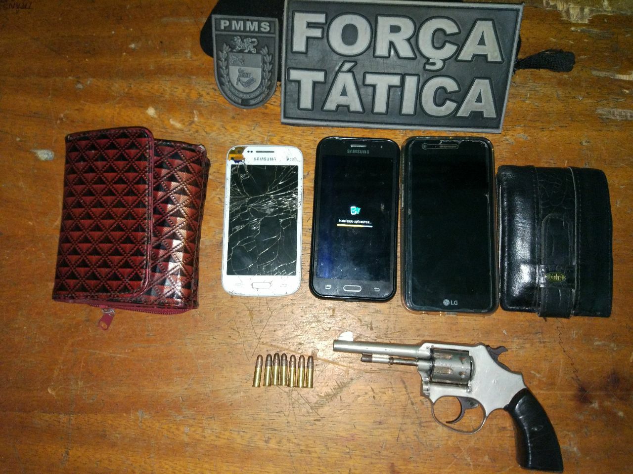 Ao ser realizada a revista pessoal nos indivíduos não foi encontrado nada de ilícito, porém durante a busca minuciosa no interior do carro foram encontrados três aparelhos de celular, dois Galaxy, um J2 e um revólver ROSSI calibre 22 com 7 munições intactas.