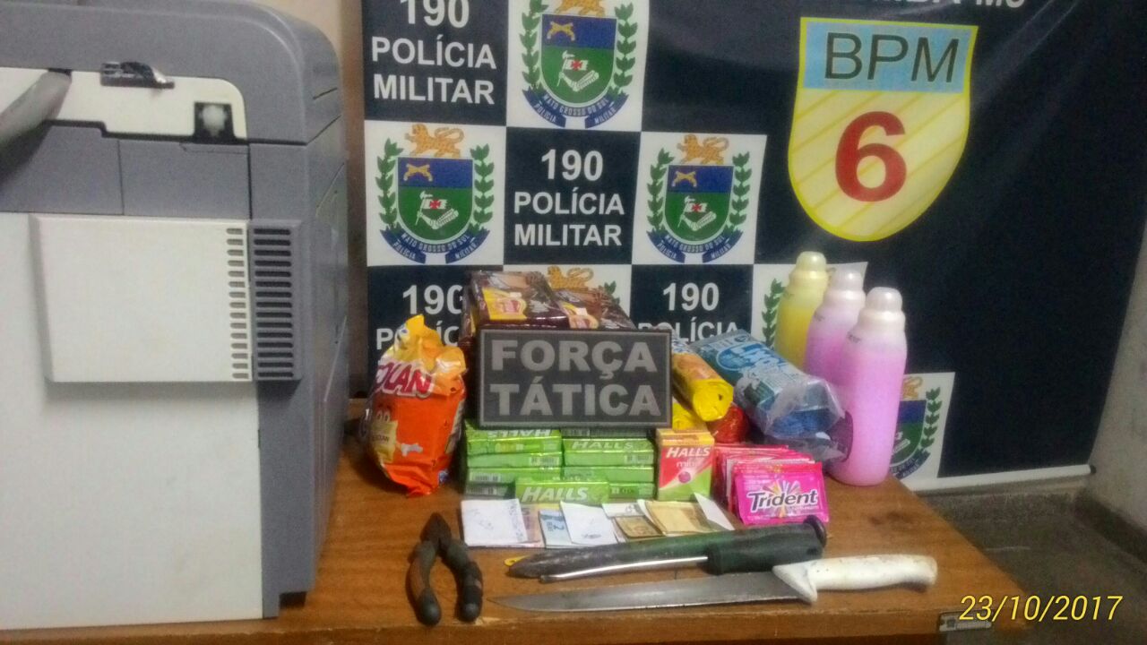 No local, foram recuperados pelos policiais vários itens já embalados para serem levados, bem como a quantia em espécie de R$285,00 reais. Diante dos fatos, a guarnição se recompôs e realizou a detenção do segundo autor, conduzindo os dois evolvidos, um de 54 anos e o outro de 44 anos, até a delegacia de polícia para providências.