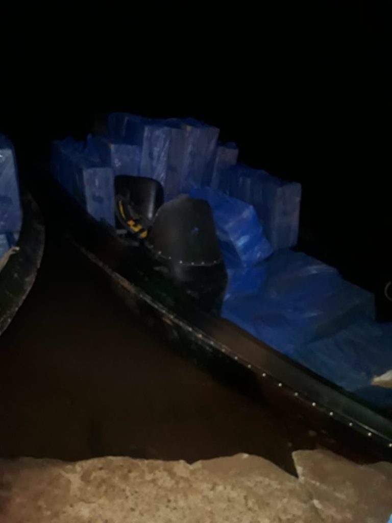 Diante disso, os policiais encontraram 02 lanchas que estavam sendo carregadas com caixas de cigarros que estariam dentro de um caminhão. O trabalho estaria sendo realizado por mais ou menos dez pessoas que evadiram-se para o rio Paraná após abordagem policial.