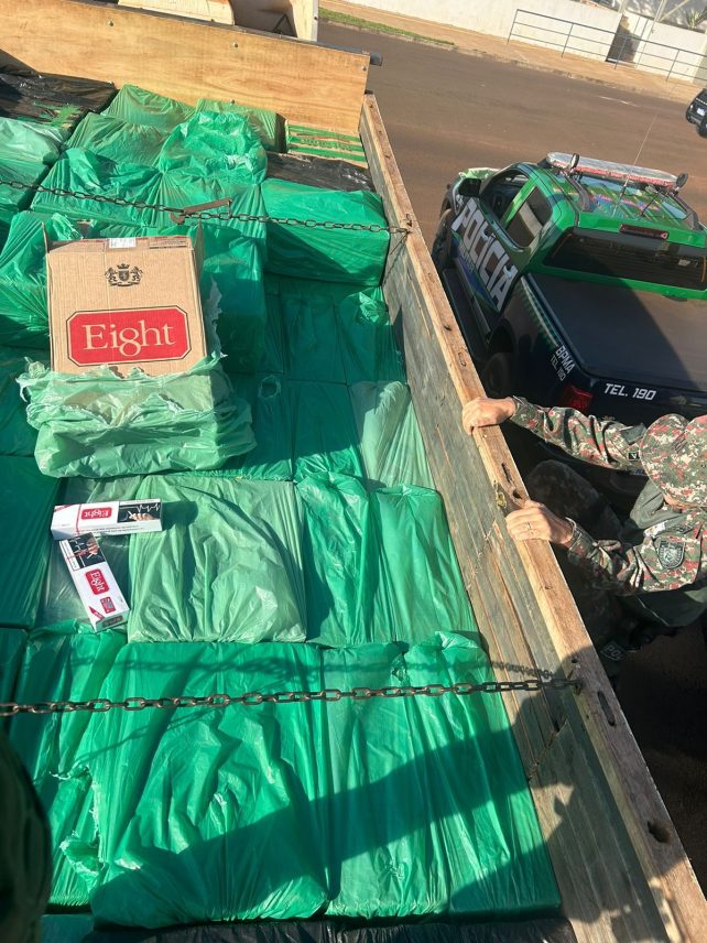 No decorrer de uma vistoria em área de Reserva Legal no município de Japorã – MS, uma das equipes se deparou com indivíduos, às margens do rio, descarregando uma carga de um caminhão para uma lancha de grande porte, que se encontrava em um porto da região conhecido como ‘Big Brother’. Ao avistarem a viatura policial, os indivíduos empreenderam fuga em embarcações que estavam no rio. Após diligências, a guarnição constatou que o caminhão estava carregado com diversas caixas de cigarro de marca paraguaia (8.900 maços) e que o veículo estava com restrição de furto. Diante das circunstâncias, a lancha, o caminhão e a carga de cigarros foram apreendidos.